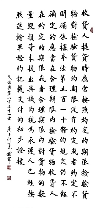 民法典第八百三十一条 收货人提货时应当按照约定的期限检验货物。对检验货物的期限没有约定或者约定不明确,依据本法第五百一十条的规定仍不能确定的,应当在合理期限内检验货物。收货人在约定的期限或者合理期限内对货物的数量、毁损等未提出异议的,视为承运人已经按照运输单证的记载交付的初步证据。