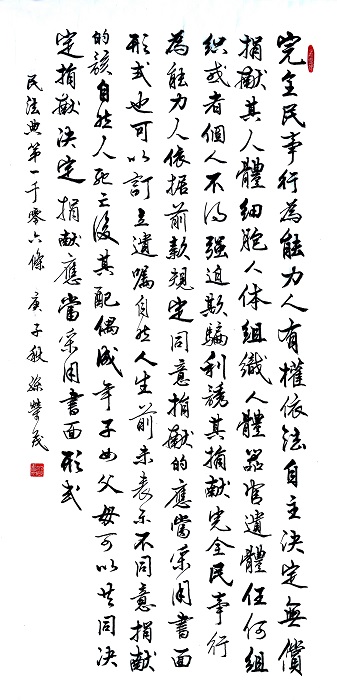 民法典第一千零六条 完全民事行为能力人有权依法自主决定无偿捐献其人体细胞、人体组织、人体器官、遗体。任何组织或者个人不得强迫、欺骗、利诱其捐献。完全民事行为能力人依据前款规定同意捐献的,应当采用书面形式,也可以订立遗嘱。自然人生前未表示不同意捐献的,该自然人死亡后,其配偶、成年子女、父母可以共同决定捐献,决定捐献应当采用书面形式。