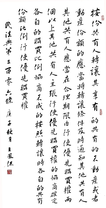 民法典第三百零六条 按份共有人转让其享有的共有的不动产或者动产份额的,应当将转让条件及时通知其他共有人。其他共有人应当在合理期限内行使优先购买权。
