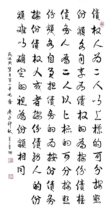 民法典第五百一十七条 债权人为二人以上,标的可分,按照份额各自享有债权的,为按份债权;债务人为二人以上,标的可分,按照份额各自负担债务的,为按份债务。