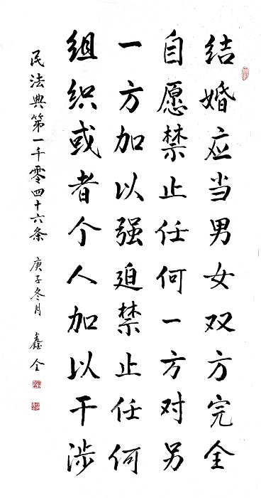民法典第一千零四十六条 结婚应当男女双方完全自愿,禁止任何一方对另一方加以强迫,禁止任何组织或者个人加以干涉。