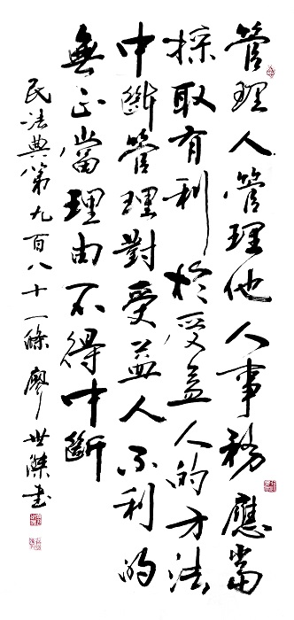 民法典第九百八十一条 管理人管理他人事务,应当采取有利于受益人的方法。中断管理对受益人不利的,无正当理由不得中断。