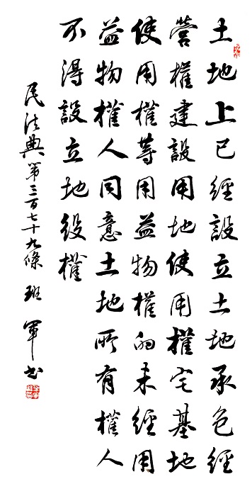 民法典第三百七十九条 土地上已经设立土地承包经营权、建设用地使用权、宅基地使用权等用益物权的,未经用益物权人同意,土地所有权人不得设立地役权。