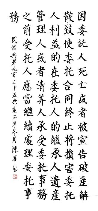 民法典第九百三十五条 因委托人死亡或者被宣告破产、解散,致使委托合同终止将损害委托人利益的,在委托人的继承人、遗产管理人或者清算人承受委托事务之前,受托人应当继续处理委托事务。