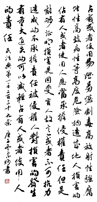民法典第一千二百三十九条 占有或者使用易燃、易爆、剧毒、高放射性、强腐蚀性、高致病性等高度危险物造成他人损害的,占有人或者使用人应当承担侵权责任;但是,能够证明损害是因受害人故意或者不可抗力造成的,不承担责任。被侵权人对损害的发生有重大过失的,可以减轻占有人或者使用人的责任。