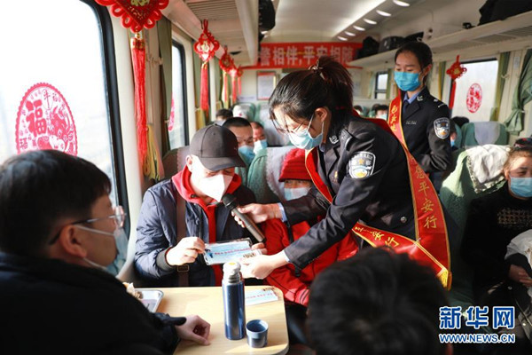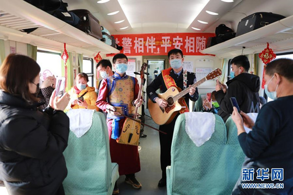 春运临近,包头铁路公安处组织开展“铁警相伴 平安相随”主题宣传活动。1月25日,在由包头开往南宁的Z338次列车上,包头铁路公安处民警以丰富多彩的文艺演出为载体,进行春运出行防疫知识宣传。 新华社发