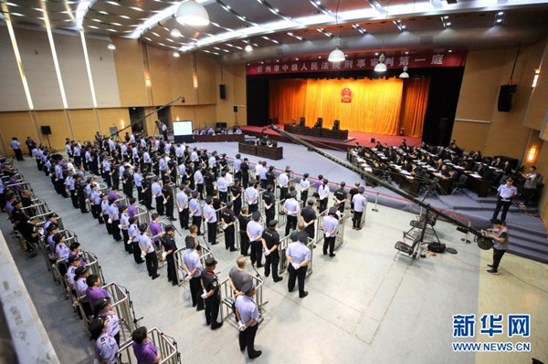 山西省忻州市中级人民法院依法公开开庭审理被告人朱强等59人涉嫌黑社会性质组织一案(2019年6月24日摄)。新华社发