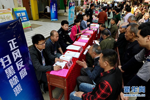 2018年4月1日,福建省建瓯市接访工作人员在小桥镇墟日上接受群众来访。建瓯市纪委在反腐“拍蝇”和扫黑除恶专项斗争中,将治理党员干部涉黑涉恶问题作为整治群众身边腐败问题的重要工作,通过专项巡察和下乡接访等方式广泛听取群众意见,收集问题线索,推进全面从严治党向基层延伸。新华社记者张国俊摄