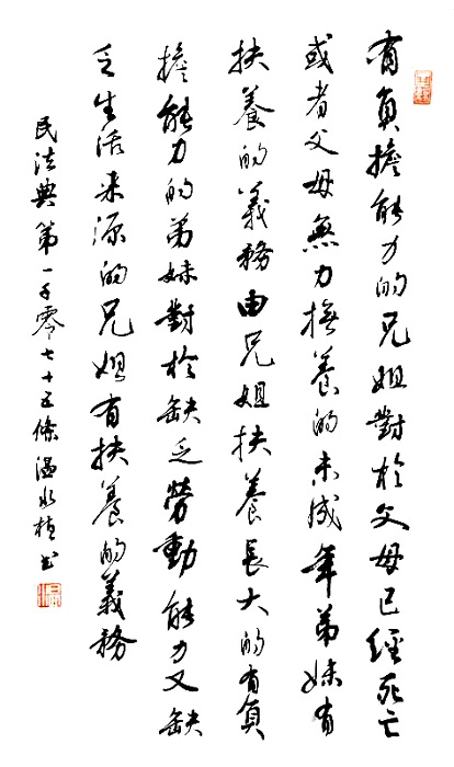 民法典第一千零七十五条 有负担能力的兄、姐,对于父母已经死亡或者父母无力抚养的未成年弟、妹,有扶养的义务。
