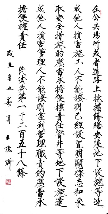 民法典第一千二百五十八条 在公共场所或者道路上挖掘、修缮安装地下设施等造成他人损害,施工人不能证明已经设置明显标志和采取安全措施的,应当承担侵权责任。