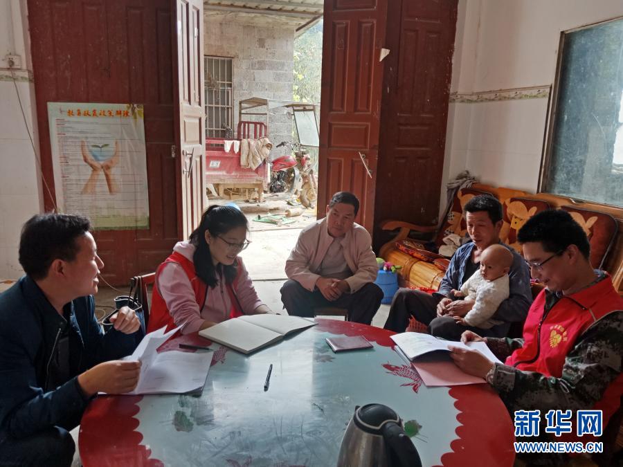 百坭村村委会委员罗彩航(右)在脱贫户家中走访(2月18日摄)。新华社记者 麦凌寒 摄
