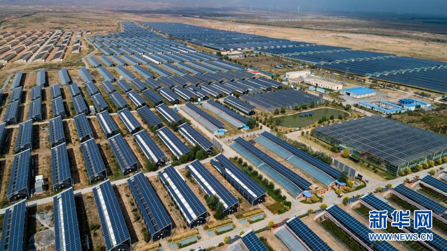 俯瞰宁夏银川市永宁县闽宁镇原隆村的光伏大棚(无人机照片,2019年9月3日摄)。新华社记者 王鹏 摄