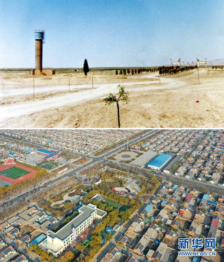 这是一张拼版照片。上图为宁夏银川市永宁县闽宁镇建设初期景象(资料照片);下图为2020年11月11日拍摄的宁夏银川市永宁县闽宁镇原隆村(无人机照片,新华社记者冯开华摄)。新华社发