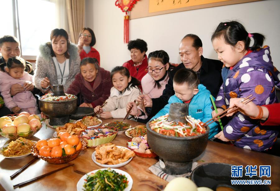 大年三十,在宁夏银川市永宁县闽宁镇福宁村,谢兴昌(右二)和家人一起吃团圆饭(2020年1月24日摄)。新华社记者 王鹏 摄