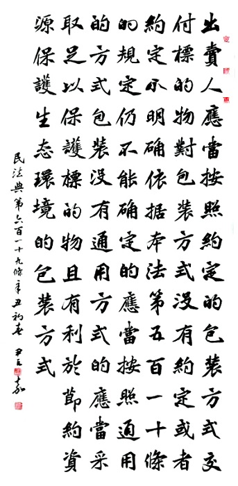 民法典第六百一十九条 出卖人应当按照约定的包装方式交付标的物。对包装方式没有约定或者约定不明确,依据本法第五百一十条的规定仍不能确定的,应当按照通用的方式包装;没有通用方式的,应当采取足以保护标的物且有利于节约资源、保护生态环境的包装方式。