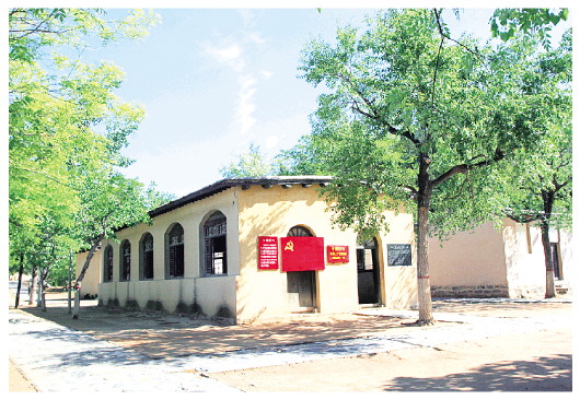 走进会场,只见正面挂着一块绛紫色的幕布,幕布上悬挂两面绣有“中国共产党”字样的党旗,党旗上方是毛泽东和朱德的两幅画像,会场两侧的白墙上悬挂着四面党旗。