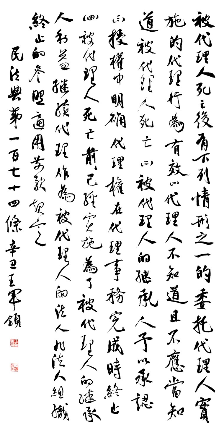 民法典第一百七十四条 被代理人死亡后,有下列情形之一的,委托代理人实施的代理行为有效: