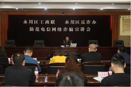 近日,重庆市永川区反诈办联合区工商联开展防范电信网络诈骗专题讲座,永川区各商会,部分民营企业家代表,工商联全体干部职工80余人参加。