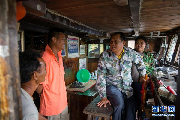 在海南省琼海市潭门港的渔船上,王书茂(右二)与渔民交流(2018年11月14日摄)。新华社发(宋国强 摄)