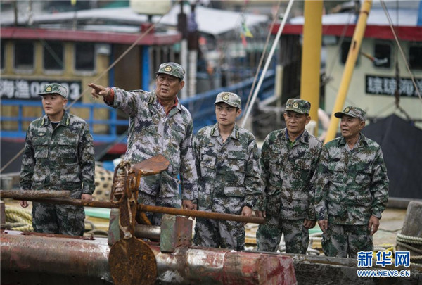 在海南省琼海市潭门镇,潭门海上民兵连副连长王书茂(左二)在组织民兵开展训练任务(2018年12月10日摄)。新华社发(宋国强 摄)