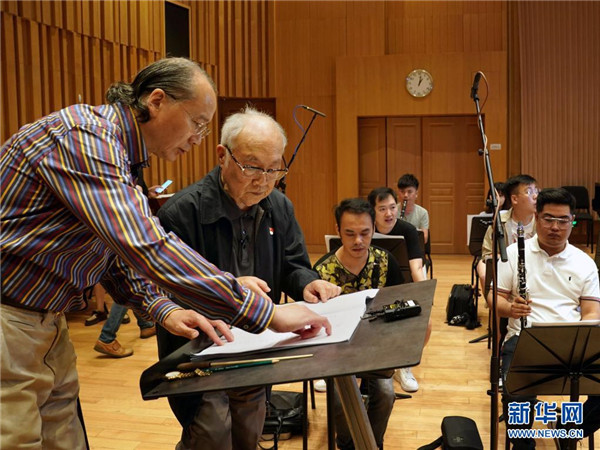 6月9日,吕其明(左二)在上海爱乐乐团录制管乐版《红旗颂》的现场,与指挥林友声讨论乐谱。新华社记者 刘颖 摄