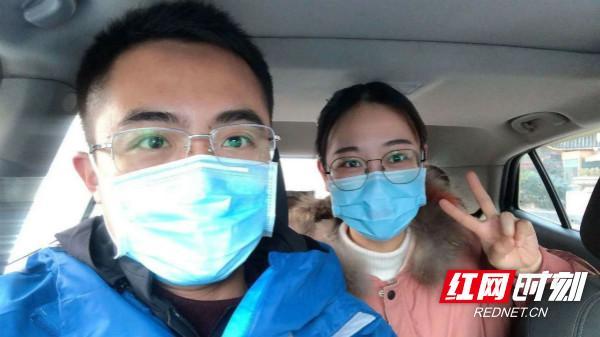 郑能量(左)接送医护人员上下班时的合影。
