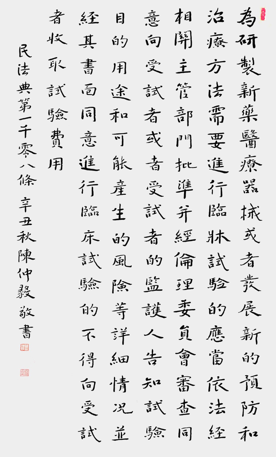 民法典第一千零八条 为研制新药、医疗器械或者发展新的预防和治疗方法,需要进行临床试验的,应当依法经相关主管部门批准并经伦理委员会审查同意,向受试者或者受试者的监护人告知试验目的、用途和可能产生的风险等详细情况,并经其书面同意。