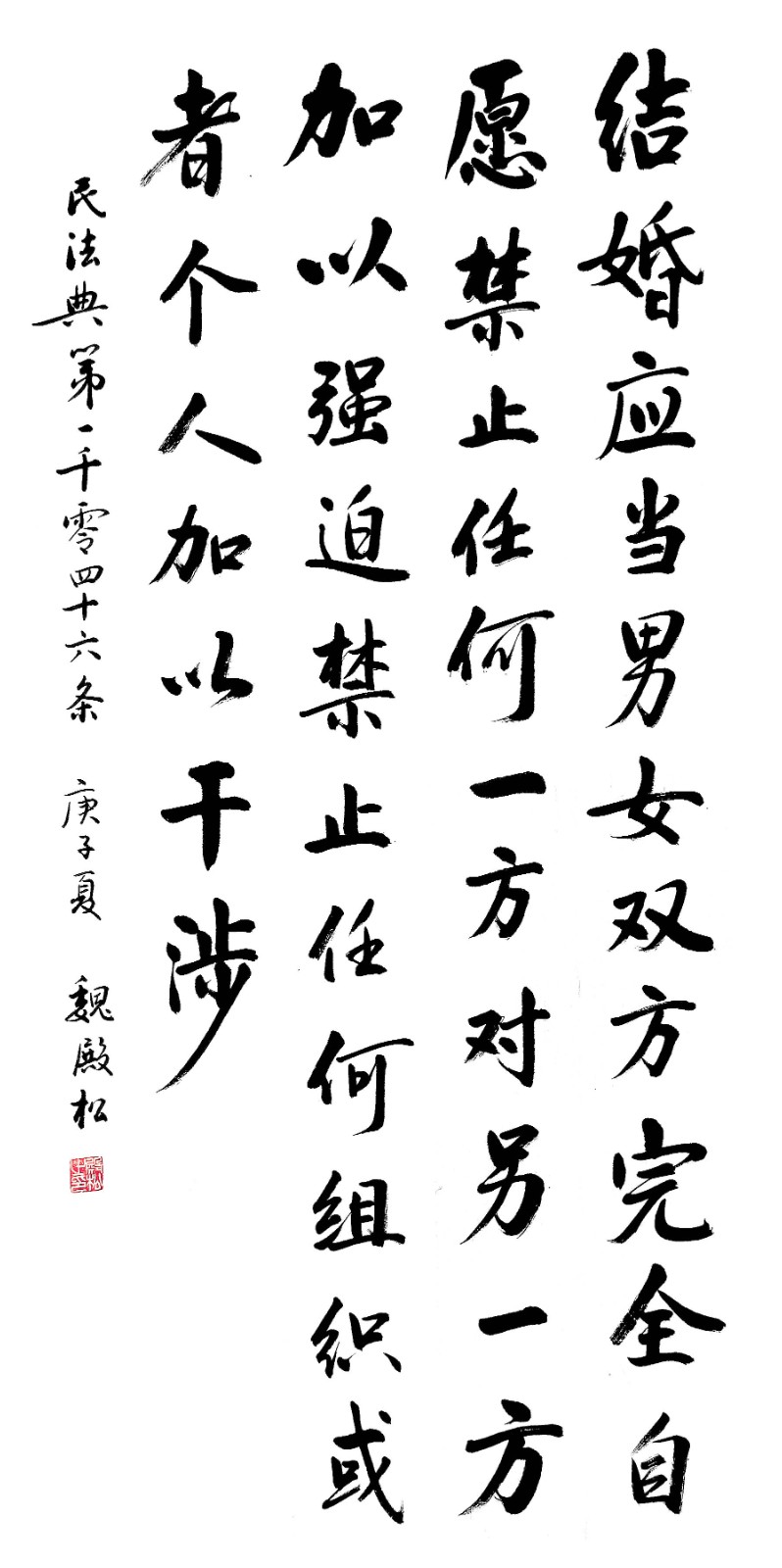 民法典第一千零四十六条 结婚应当男女双方完全自愿,禁止任何一方对另一方加以强迫,禁止任何组织或者个人加以干涉。