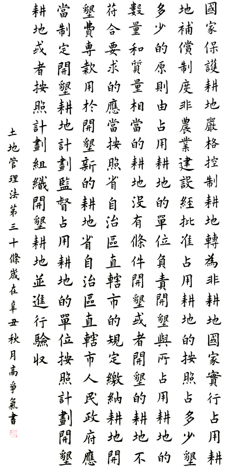 继1600余位书法家参与书写《中华人民共和国民法典》全部1260条法条之后,法治日报社联合自然资源部法规司、自然资源部书画研究会和北京昌平书法家协会,将笔端对准土地管理“一法一条例”,即《中华人民共和国土地管理法》和《中华人民共和国土地管理法实施条例》。