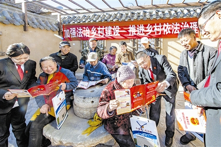 11月30日上午,在第8个国家宪法日来临之际,全国模范法官、山西省左权县人民法院副院长杨春光(右三)带领法院干警深入半坡村、泽城村,为群众发放《宪法宣传手册》《民法典》《诉讼服务指南》等普法材料,耐心解答群众疑惑。毕浩、翟宏岩 摄