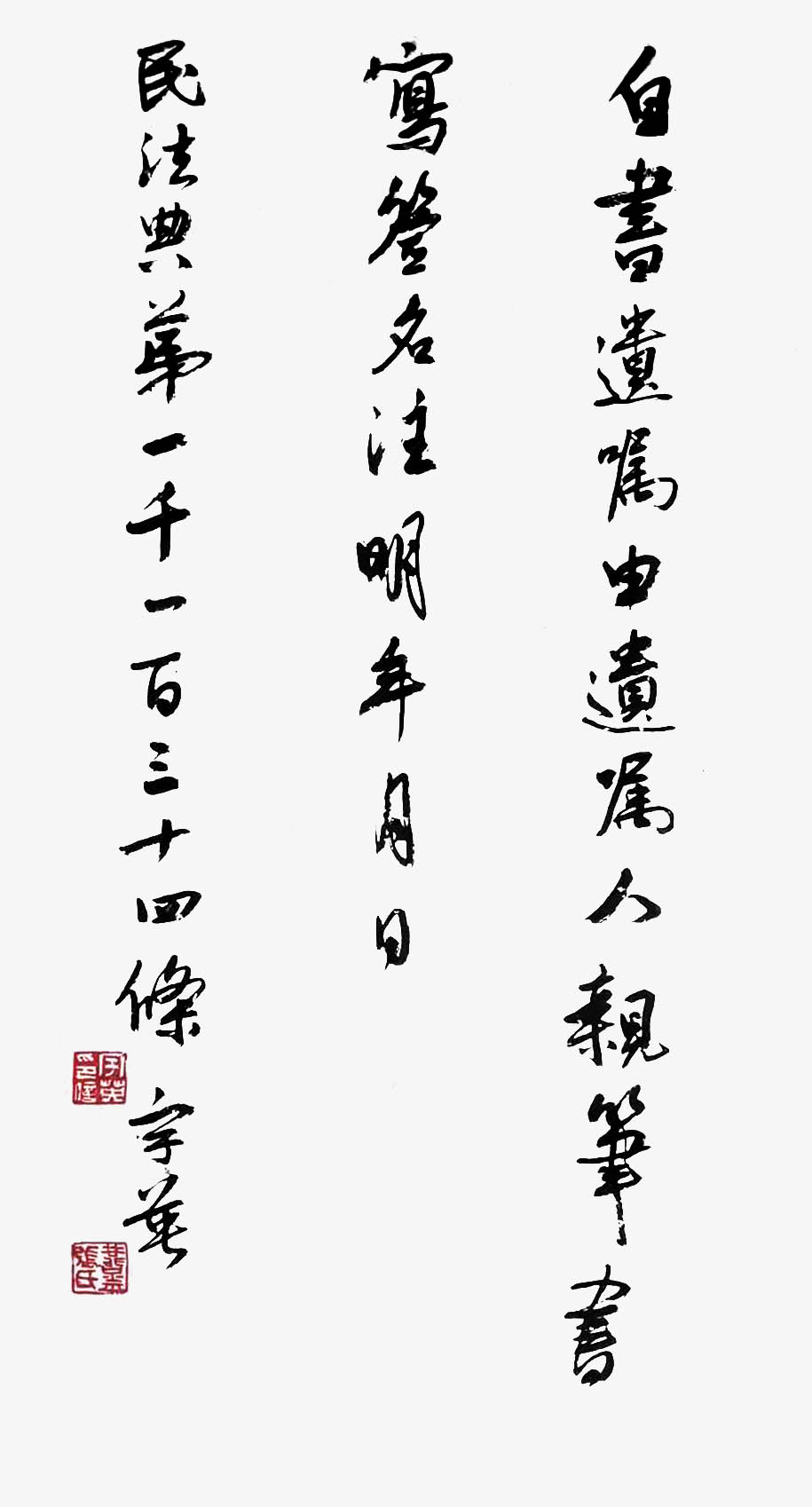 民法典第一千一百三十四条 自书遗嘱由遗嘱人亲笔书写,签名,注明年、月、日。