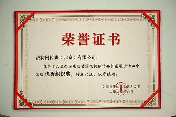 法治网在第十六届全国法治动漫微视频作品征集展示活动中荣获优秀组织奖。