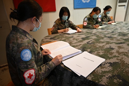 维和医疗分队官兵学习法律法规和联合国规范性文件。李晓龙 摄