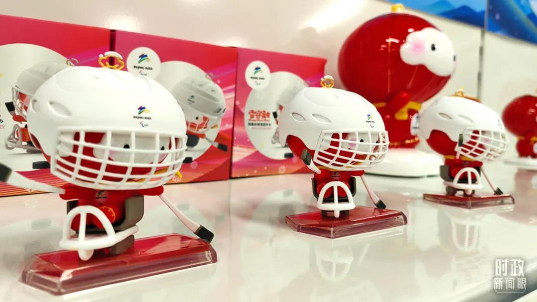 △冬奥村特许商品零售店内,冬残奥会吉祥物“雪容融”冰球运动文创产品亮相。(总台央视记者钟锋拍摄)
