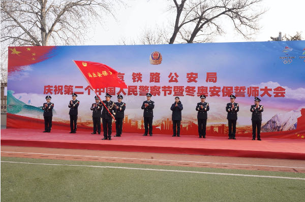 “我是中国人民警察,我宣誓.......”在北京铁路公安局党委书记、局长王旭章带领下,110名干部民警代表组成“110”队形,面向警旗,庄严宣誓,庆祝自己的节日。在随后进行的北京铁路公安局冬奥安保誓师大会上,王旭章又分别为“党员干部先锋队”“站区安保突击队”“线路防控突击队”“应急处置突击队”和“赛时运送护卫队”五支冬奥安保维稳专业队授旗,并代表北京铁路公安局党委庄重承诺:北京铁路公安机关全体干部民警将以铁路冬奥安保“主场、主责、主战、主力”的政治站位和责任担当,以“主战用我,用我必胜”的战斗意志和积极勇为,忠诚履责、践行使命,坚决确保辖区的绝对安全,在北京冬奥盛会中,展现北京铁警风采,奉献忠诚与作为!