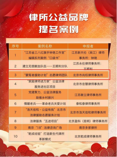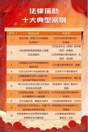 1月26日,法治日报社联合中国政法大学律师学研究中心面向全国开展的“首届律师公益(社会责任)典型案例”征集宣传活动经过两个多月的征集,从最初的1000多个申报案例中,初选出200个案例进入公众投票环节,结合公众投票和专家评审,评选出十大律师公益类别中的一百个典型案例与一百个提名案例。尚权律师事务所十五年来一直致力于法律公益事业,申报此次征集活动的“‘蒙冤者援助计划’志愿律师团队”与“躬身法援 探索公共法律服务‘泽库模式’”两大案例均荣列其中。