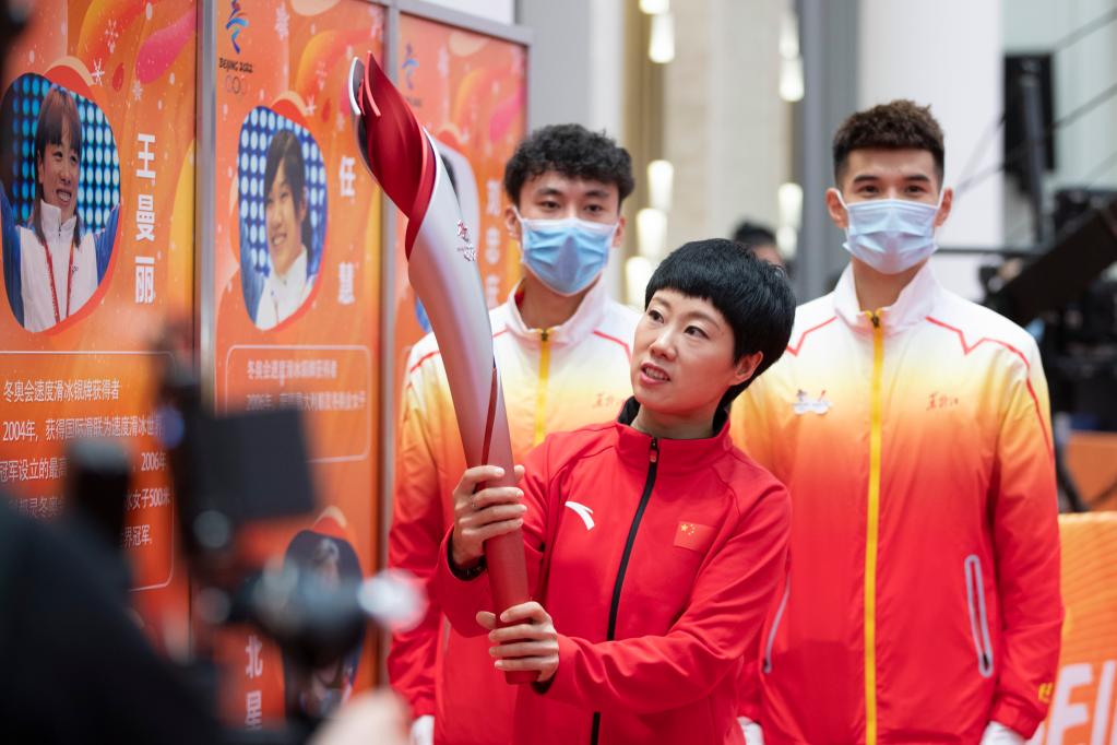 1月5日,冬奥会短道速滑冠军张会(中)在北京2022年冬奥会火炬展示活动现场手持火炬进行展示。新华社记者 张涛 摄