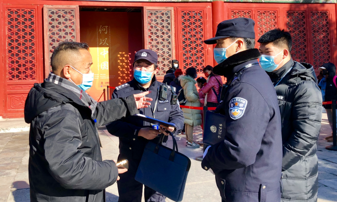 故宫派出所民警王文彪、刘树涵走访“格区”文物展览防疫工作情况。董凡超摄