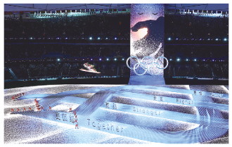 图为开幕式上的焰火表演呈现出中英文“立春”和“spring”字样。 新华社记者 邢广利 摄