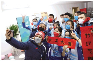 春节期间,北京冬奥会延庆赛区冬奥村里张灯结彩,志愿者和各代表团成员相聚一堂,庆祝欢乐祥和的春节。图为塞尔维亚代表团成员和志愿者在延庆冬奥村合影留念。新华社发 肖绍雯 摄