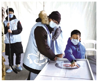 图为李智勇(左二)在海淀区冬奥文化广场指导市民体验桌上冰壶。