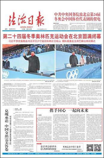 北京冬奥会为中国发展提供了新机遇,也为世界贡献了更多可能。“一起向未来”是北京冬奥会的愿景,简洁凝练的表述中蕴含着博大智慧和深厚情怀,发出了构建人类命运共同体的中国倡议。各国运动员在赛场上,呈现给世界的不仅有挑战自我、突破极限的拼搏精神,还有相互支持、彼此成就的美好友谊。在对手比赛失利后主动安慰、成功后真诚拥抱祝福……一幕幕心手相连、情意相牵的动人场景,在瞬间定格成为永恒。北京冬奥会以全球共通的体育语言和体育精神,积极践行了“更快、更高、更强——更团结”的奥林匹克格言,生动地诠释着人类命运共同体的理念,向全世界传递出明确信息:奥林匹克精神是人类团结的灯塔,任何国家、民族、宗教的人民都可以超越分歧,实现团结与合作。