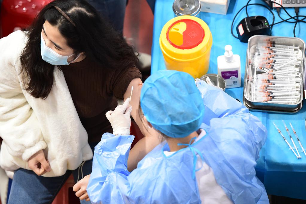2022年1月6日,在安徽农业大学新冠疫苗接种点,医护人员为师生接种新冠疫苗加强针。(新华社记者黄博涵 摄)