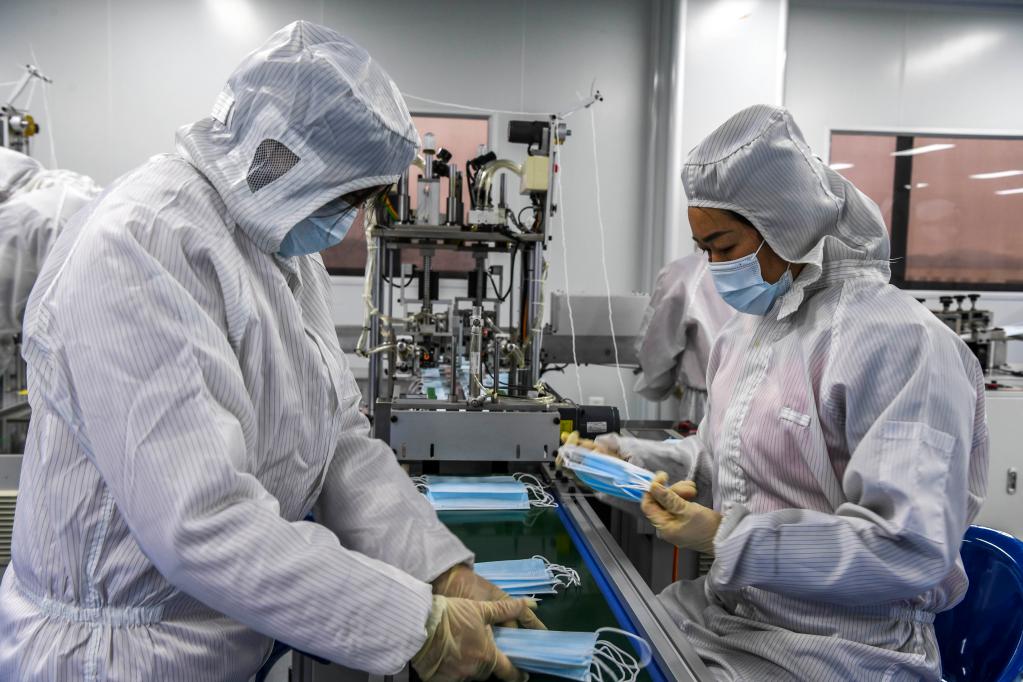 2022年2月18日,在广西百色市一家口罩生产企业内,工作人员在生产线上忙碌。自2月15日零时起,广西百色市部分县(市、区)解除“不进不出”管控措施,当地正有序复工复产。(新华社记者曹祎铭 摄)