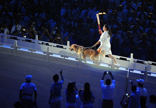 2008年9月6日,中国第一位残奥会冠军平亚丽在北京残奥会开幕式上手持火炬传递。新华社记者王颂摄
