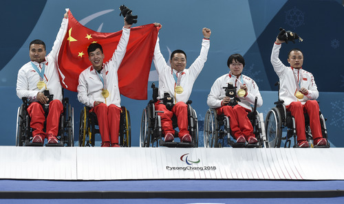 2018年3月17日,中国队在平昌冬残奥会轮椅冰壶比赛中获得金牌。图为队员王海涛、陈建新、刘微、王蒙、张强(从左至右)在颁奖仪式上。新华社记者夏一方摄