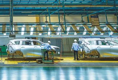 在海南省海马汽车海口基地的焊装车间内,工人进行流水线作业。