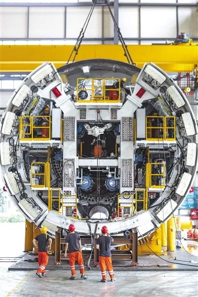 广东省佛山市顺德区,在中铁华隧联合重型装备有限公司生产车间内,工人正在组装盾构主机。