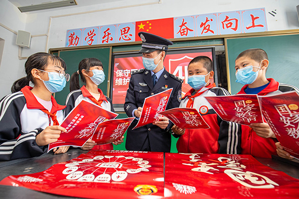 ③ 4月13日,新疆博州边境管理支队夏尔布河边境派出所移民管理民警来到新疆生产建设兵团第五师86团第二中学开展全民国家安全教育日宣传教育活动。民警结合国家反诈中心App、宣传短片、宣传海报等,积极为在校师生解读什么是国家安全、普通公民应尽的国家安全责任和义务、危害国家安全的违法行为和具体情形。图为活动现场。法治日报全媒体记者 潘从武 通讯员 芦胜磊 摄