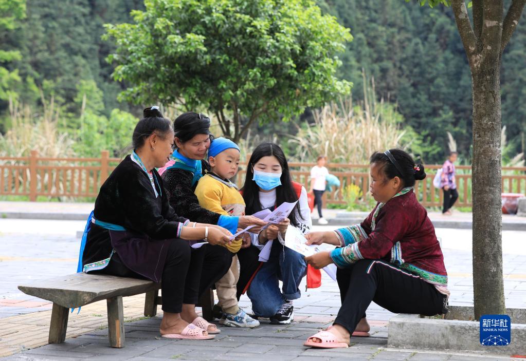 4月14日,志愿者在贵州省黔东南苗族侗族自治州从江县刚边乡三百河社区向人们讲解国家安全相关知识。新华社发(罗京来 摄)